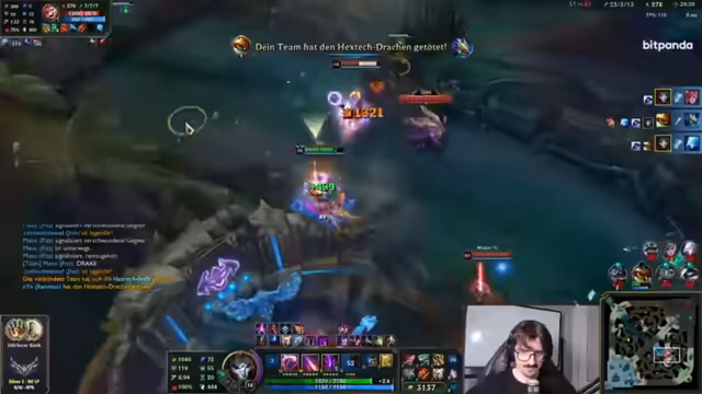 02:37:17Zu Beginn des Streams fallen mehrere toxische und rassistische Kommentare, die im Chat aufgegriffen und als reportbar angesehen werden. Im selben Abschnitt wird der Jungle-Gameplan besprochen, inklusive der Kontrolle des Drachen. Der Streamer fordert zum Erobern des Drachen auf und befiehlt seinem ADC, die Lane zu halten, während er selbst in den Jungle geht, um Draken-Farm sicherzustellen und ggf. zu ganken.