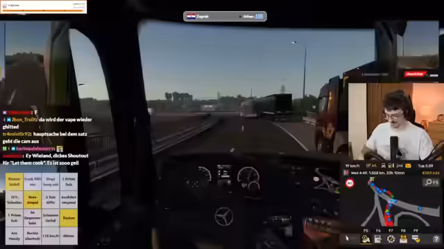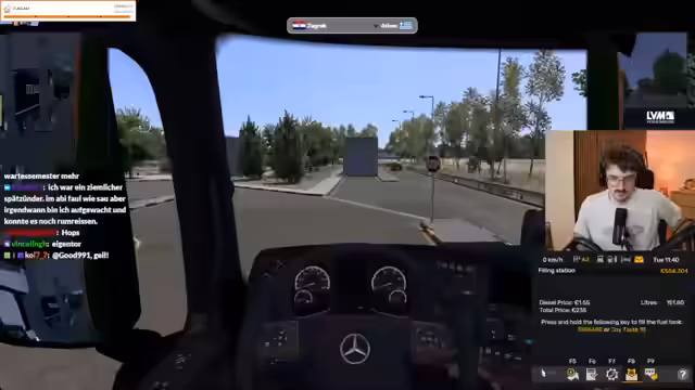 03:11:00Der Streamer hat Probleme beim Rückwärts einparken und muss tanken und schlafen, bevor er die Fracht abholt, um dies nicht mit der Fracht tun zu müssen. Er dachte, er hätte alle Länder gekauft, aber den kompletten Balkan hatte er nicht. Er stellt fest, dass er mit dem neuen LKW eine geringere Reichweite hat. Der Streamer fährt in die falsche Richtung und beschimpft die Scania-Fahrer. Er muss noch Fracht holen und es ist sehr viel los. Zagreb klingt für ihn eher nach Tschechien als nach Kroatien. Durch die engere Achskonfiguration ist der Tank kleiner geworden. Er findet es geil, dass der Stern jetzt leuchtet und schaltet die Headlights ein. Der Streamer fährt in Richtung Zagreb und fällt in einen anderen Trucker rein.