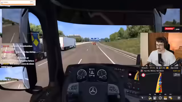 03:02:20Nachdem der Streamer eine Weile gewartet hat, wird beschlossen, zu einer Firma zu fahren, um Fracht abzuholen. Es wird diskutiert, wie cool es wäre, wenn die anderen Spieler die beiden Streamer immer vorfahren lassen würden. Der Streamer fährt zu einer Firma, um dort etwas abzuholen, und der andere Streamer fährt hinterher. Der Wunsch nach Tageslicht wird geäußert, um die Fahrzeuge besser begutachten zu können. Der Streamer hat Alarm 5080 0 genommen, RGB. Es wird festgestellt, dass das Schild auf der falschen Seite ist und der Actros des Streamers als sehr geil empfunden wird. Die roten Ampeln werden ignoriert, weil der Streamer zu oft in den Chat schaut. Erik hat es erwischt, als über rote Ampeln gefahren wurde. Es wird festgestellt, dass es mit 200 Leuten extrem stressig wird, da einzufahren.