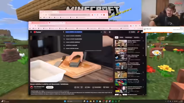 03:12:29Ein großes Thema des Streams ist der gerade gekaufte Schleifstein für Messer. Der Streamer erklärt seine Funktion und die Notwendigkeit, von grob nach fein zu schleifen. Der Chat ergänzt mit Tipps über die Haltbarkeit und Wartung mit einem Wettstahl. Später wird ein geplanter League-of-Legends-Turnier erwähnt, bei dem noch nicht das ganze Team teilnehmen kann. Auch die Zukunft des Spielens auf dem Hugo SMP mit möglichen Möbelkäufen und Plünderungsabsichten wird thematisiert.