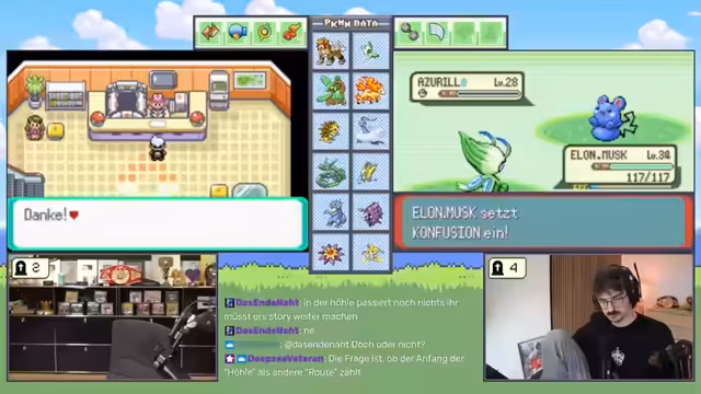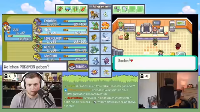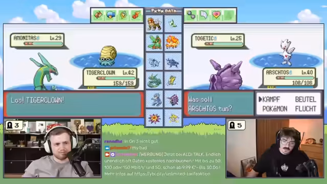 09:45:37Der Streamer kämpft gegen mehrere starke Trainer in der Arena, wobei er seine Teamzusammenstellung und Attackenwahl strategisch anpasst. Es kommt zu sehr knappen und spannenden Kämpfen, in denen gegnerische Pokémon wie Voltoball und Panikon durch spezielle Attacke-Kombinationen besiegt werden werden. Die Kämpfe sind risikoreich und erfordern schnelle Entscheidungen, um den Sieg zu sichern und wertvolle Erfahrungspunkte (XP) zu erhalten.