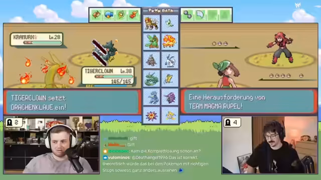 04:07:52Im weiteren Verlauf des Magma-Verstecks steht der Streamer einem Trainer mit Gardevoir gegenüber, was sich als extrem schwierig erweist. Das gegnerische Gardevoir ist Level 38 und besitzt starke Attacken. Der Streamer verliert nacheinander seine wertvollsten Pokémon, wie Absol und Celebi, durch Volltreffer. Trotzdem gewinnt er den Kampf mit seinem letzten Pokémon, doch die Erfahrung zeigt, wie gefährlich und unberechenbar die Kämpfe auf hohem Level sind und dass die Vorbereitung auf den nächsten Kampf, speziell für die Top 4, dringend verbessert werden muss.