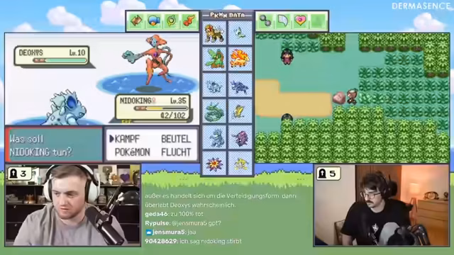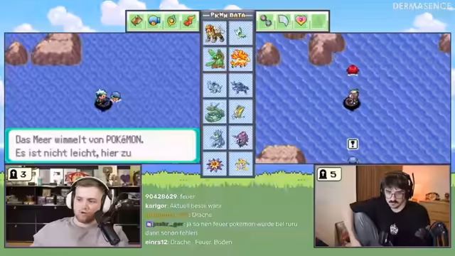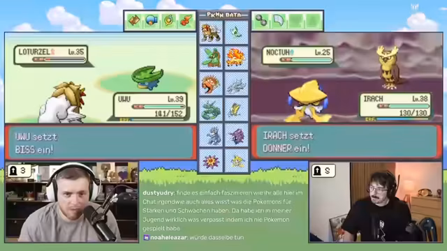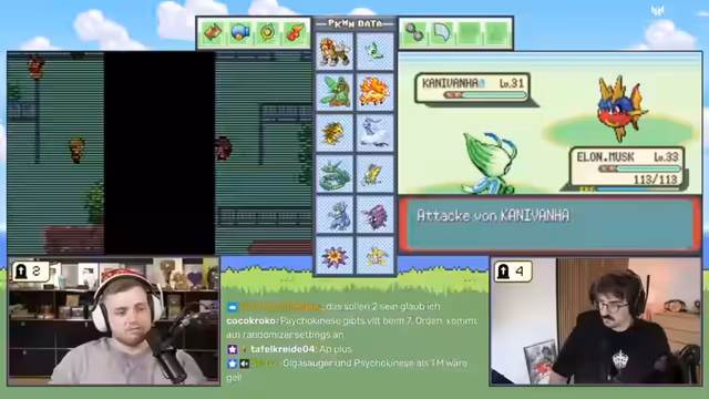 04:55:33Eine lustige Ablenkung ereignet sich, als ein Zuschauer nach 30 Jahren herausfindet, dass 'Arbok' im Deutschen 'Eckens' bedeutet. Dies wird im Chat intensiv diskutiert. Die Stimmung trübt sich jedoch wieder, als wichtige Pokémon wie Absol, Glutexo (der Glurak-Vorläufer) und Swirloch im Kampf sterben. Dies ist ein massiver Rückschlag für das Team, da der Streamer alle drei Starter der ersten Generation verloren hat. Das Gameplay wird fortgesetzt, indem man verspricht, die neuen Pokémon wie Kramurxs zu leveln, bevor man wieder zum Boss zurückkehrt.