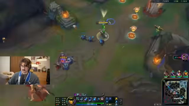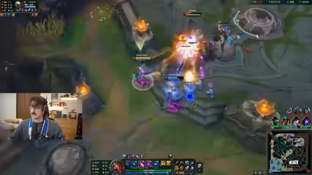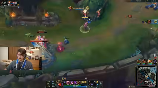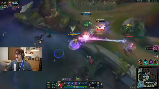 03:05:43Der Streamer und sein Partner beginnen ihre Runde in der Kluft. Der Streamer wählt den Jhin als ADC, nachdem er Jinx und Caitlyn als zu repetitiv empfunden hat. Sein Partner wählt einen Tank. Das Team der Gegner besteht aus einem starken Echo-Jungler und einer Irelia. Während des Spiels kommt es zu technischen Problemen, da der Streamer mit einem halben Bildschirm spielen muss und seine Benachrichtigungen stören. Trotzdem gelingt es dem Team, die Botlane zu dominieren und den Turm zu zerstören.