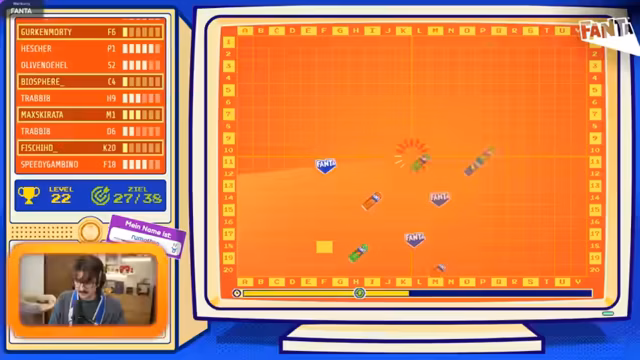 05:57:19Um 21439 Uhr wird das Spiel gewechselt zu 'Save the Deal'. Hierbei handelt es sich um ein 'Schiffe-versenken'-ähnliches Minispiel, bei dem Fanta-Symbole auf einem Raster durch Eingabe von Koordinaten abgeschossen werden müssen. Die Herausforderung steigt rapide, da sich die Symbole fortbewegen und die Spieler nur eine begrenzte Anzahl an Schüssen haben. Der Streamer gibt die Taktik vor, dass Spieler nur auf die Zeilen schießen sollen, die mit dem Anfangsbuchstaben ihres Chat-Namens übereinstimmen, um eine systematische Vorgehensweise zu gewährleisten.