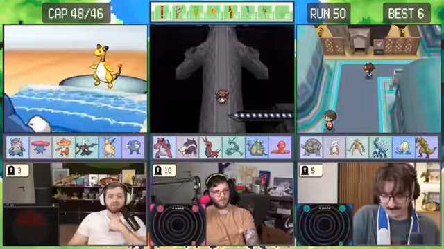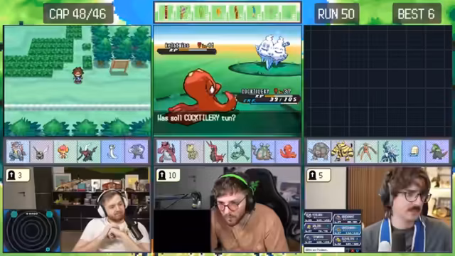 02:47:17Nachdem der Arenaleiter besiegt wurde, geht der Streamer auf die Jagd nach einem legendären Pokémon. Es kommt zu einem Triple Legendary Encounter mit Deoxys, welches sich jedoch wegteleportiert, bevor der Streamer es fangen kann. Er beschreibt das Encounter als den schlechtesten aller Zeiten und zeigt sich extrem frustriert über das glücklose Verpassen des legendären Pokémon.