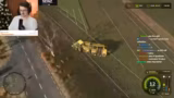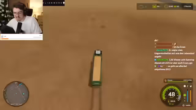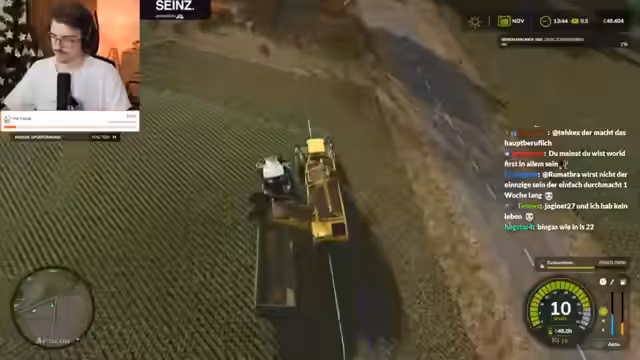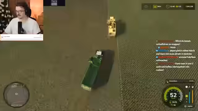 05:28:44Die Spieler befinden sich mitten im Gameplay des Landwirtschafts-Simulators. Sie koordinieren das Befüllen von Dünger-Containern und planen die Ernte und das Düngen der Felder. Es tauchen technische und spielmechanische Probleme auf, wie unerwartetes Unkraut auf den angebauten Weizenfeldern, das durch einen Bug entstanden sein könnte. Trotz Frustration über die monotone Arbeit am Feld, wird die Tätigkeit mit der harten realen Landwirtschaft verglichen und sowohl als anstrengend als auch als befriedigend empfunden.