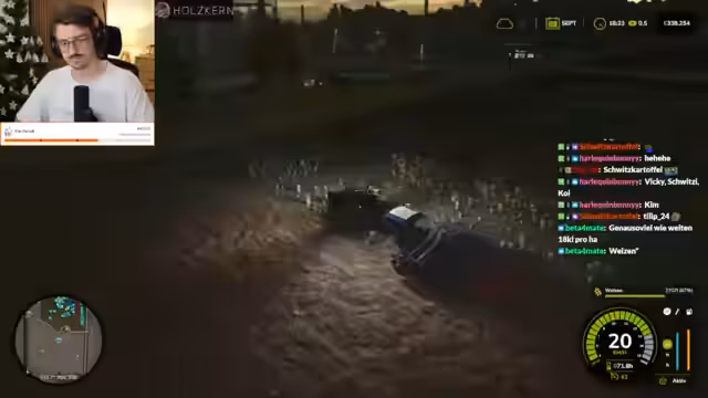 03:45:58Die Konzentration liegt auf der Feldarbeit. Man pflanzt Weizen an und diskutiert über die korrekte Abfolge von Düngen und Kalken des Bodens vor dem Säen. Während der Arbeit wird die Ästhetik des Spiels bewundert, wie die Abenddämmerung, die jedoch die Bitrate und die Performance des Streams negativ beeinflussen kann. Parallel dazu gibt es technische Analysen des Lenkrads, bei dem das Force-Feedback nicht richtig funktioniert, und eine Erfahrung mit einer VR-Brille wird als problematisch beschrieben, die zu Bluescreens führte. Der Streamer erklärt, warum er auf solche Zusatzgeräte verzichtet.