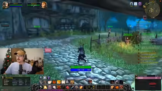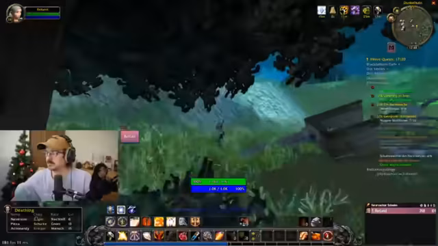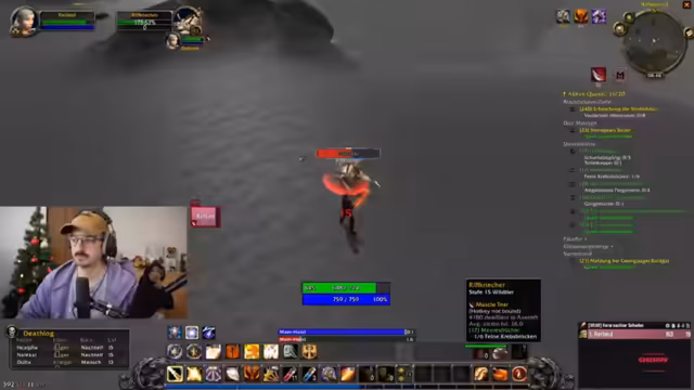 02:04:57Am Ziel angelangt, sucht der Streamer nun verzweifelt nach Mitspielern für Burg Schattenfang. Der Dungeon gilt als äußerst gefährlich für einen Level-24-Charakter. Zunächst hofft er, dass Stream-Zuschauer spontan erscheinen, um ihn zu begleiten. Als dies nicht der Fall ist, versucht er, über den Gruppenfinder eine Party zusammenzustellen. Er schafft es jedoch nicht, einen Heiler zu finden, und muss daher mit nur zwei DPS-Kriegern einem Wipe entgegenblicken oder selbst die Healer-Rolle übernehmen, was ihm nicht zusagt.