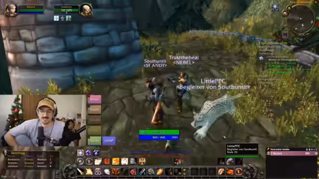 02:28:29Die Gruppe betritt Burg Schattenfang. Der Streamer, als Heiler zurückhaltend, konzentriert sich voll auf das Überwachen der Lebensbalken. Er erklärt seine Heil-Spells, insbesondere Lichtblitz, und seine Mana-Management-Strategie. Es kommt zu kritischen Situationen, in denen Groupmitglieder wie Trust the Heal und Yildritz starken Schaden nehmen und das Mana des Streamers rapide sinkt. Trotz dieser Anspannung erklärt er seine Philosophie des 'Trust the Heal' und fordert die Gruppe auf, darauf zu vertrauen.
