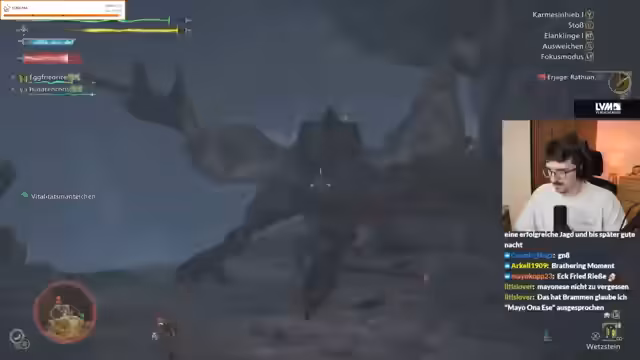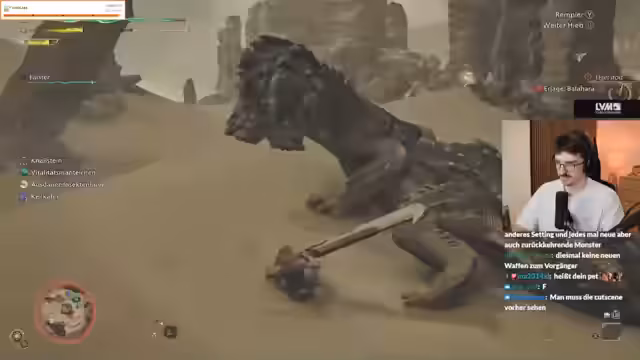 03:22:17Der Stream beginnt mit dem Ziel, die Hauptmission mit Freunden zu spielen, anstatt Nebenmissionen zu erledigen. Der erste Kampf gegen einen Balahara wird unternommen. Der Streamer testet dabei eine neue Waffe, das Großschwert, und berichtet von positiven Eindrücken, trotz anfänglicher Bedenken wegen der Performance. Der Kampf gestaltet sich langwierig und anspruchsvoll, erfordert viel Tränke und endet letztendlich mit dem Sieg, aber ohne Loot.