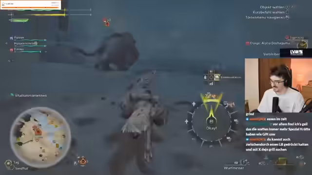 02:52:00Nach dem Kampf wechselt der Streamer erneut die Waffe, dieses Mal zur Insektenklee. Er hat Schwierigkeiten, die Kombos auszuführen, da die Monster zu mobil sind. Es wird das System der körperlichen Zones bei Monstern erklärt, die man abschlagen kann, um sie nochmal zu verletzen. Der Streamer ist frustriert über den geringen Schaden, den er mit der Waffe macht.