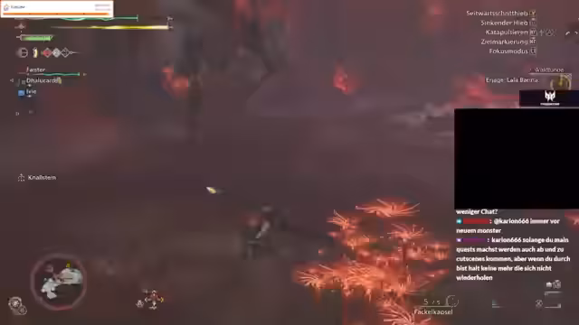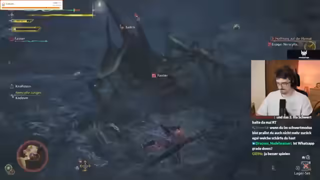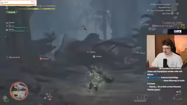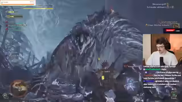 12:57:38Nach einem harten Kampf gegen ein Tentakel-Vieh wechselt der Streamer seine Taktik, indem er im Kampf mehrfach zwischen der Axt und dem Bogen wechselt. Dieser Waffenwechsel dient dazu, verschiedene Angriffsmöglichkeiten zu nutzen und den Schaden zu maximieren. Die Stimmung im Chat ist angetrieben von der Action, was zu einem chaotischen und intensiven Spielerleider führt.