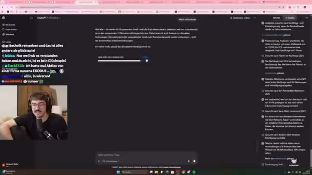 02:37:18Nachdem ein Zuschauer durch die Motivation des Streamers seine Altersvorsorge in Aktien investiert hat, werden diverse wachstumsstarke Small- und Mid-Cap-Aktien aus den Bereichen Software, KI, Robotik, Fintech, Gesundheitswesen, Energie und Cleantech vorgestellt. Der Streamer beauftragt die KI, aus einer Liste von 30 Aktien die Top 10 mit dem größten Potenzial für die nächsten zwölf Monate auszuwählen und dabei Fantasie, disruptive Technologien, Übernahmegerüchte und geopolitische Trends zu berücksichtigen. Die KI soll ein Ranking erstellen, das auf Kursgewinnen und fundamentalen Risiken basiert. Es wird festgestellt, dass das Chat-Portfolio des Kanals 33% im Plus liegt, hauptsächlich aufgrund von Rheinmetall, während Uranium Energy sogar 66% im Plus ist, was Analysten ratlos macht. Intel ist dank einer Übernahme ebenfalls stark im Plus. Der Streamer äußert sich überrascht über die Performance und vermutet Insiderwissen im Chat. Die KI recherchiert unter anderem zu Casava Sciences, Cannabis-Aktien und Feststoffbatterien, wobei sie auch Informationen aus Foren und Communities einbezieht.