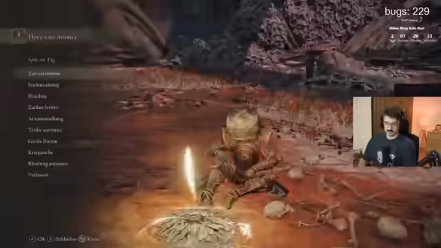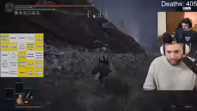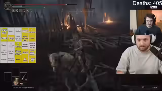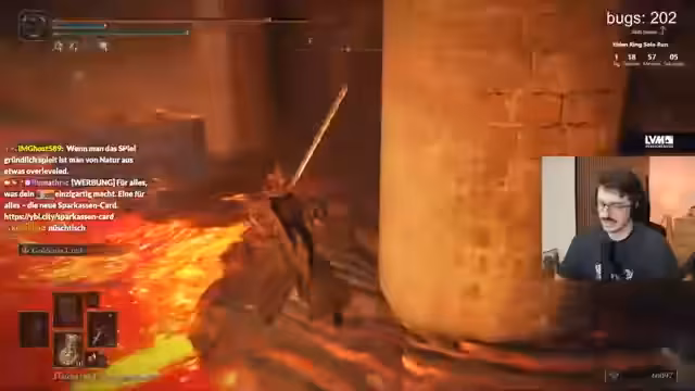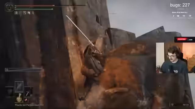 00:39:09Der Streamer fragt sich, welches Level er aktuell hat und stellt fest, dass er bereits Level 120 erreicht hat, was deutlich höher ist als bei seinem ersten Durchlauf. Er erinnert sich daran, dass er beim Godskin-Duo in seinem ersten Durchlauf große Schwierigkeiten hatte, was möglicherweise an seinem niedrigeren Level lag. Er erkundet ein Gebiet, in dem er zuvor noch nicht war und findet eine Treppe. Es wird überlegt, ob man auch ohne die Questreihe zu Rykard gelangen könnte. Der Streamer äußert sich amüsiert über eine Geste eines Charakters im Spiel. Es wird der Wunsch geäußert, Alexander (ein NPC) zu treffen, und der Streamer erinnert sich daran, ihn zuletzt nach dem Kampf gegen Radar gesehen zu haben. Nach einiger Suche findet er eine Rune. Der Streamer wundert sich, dass er einen Gegner so schnell besiegen konnte und vermutet, dass er zu dumm dafür war. Er bemerkt, dass man die Karte nicht öffnen kann, während man angegriffen wird. Die Waffen der Gegner werden als cool empfunden. Es wird die Frage aufgeworfen, ob es einen Angriff gibt, bei dem man beim Herunterfallen von einem Vorsprung Schaden verursacht. Der Streamer stellt fest, dass seine Waffe plus 21 ist. Er erinnert sich daran, dass es in anderen Souls-Teilen möglich war, beim Herunterfallen von oben zusätzlichen Schaden zu verursachen. Es wird über die Spielweise von Max diskutiert und der Streamer hofft, dass dieser bald wieder online kommt. Nach weiterer Erkundung findet der Streamer ein Item und stellt fest, dass er nur noch wenige Heiltränke hat. Er trifft auf einen dicken Gegner mit schwarzer Flamme und stellt fest, dass er diesem kaum Schaden zufügt. Nach einigen Schwierigkeiten wird der Gegner schließlich besiegt.