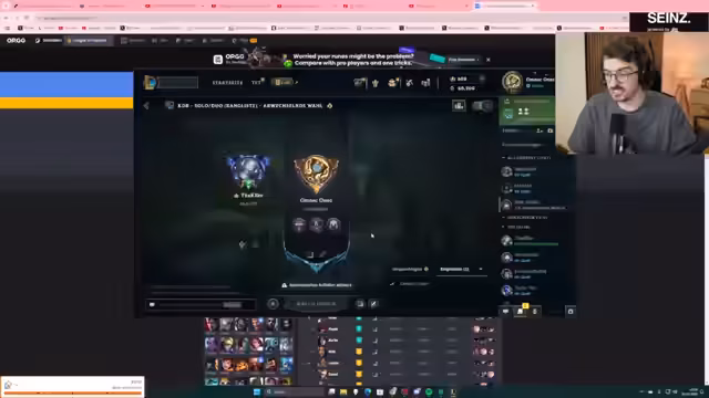 12:50:48Die Niederlage verursacht eine weitere Verärgerung über das Ranking-System. Er beschwert sich über die 'MMR-Müll', wodurch er trotz guter Leistung '28 LP' verloren hat und von 'Emerald 1 plus 22 EP' auf 'minus 28' gefallen ist. Trotz seines Missbehagens plant er, weiterzuspielen und sich zu verbessern. Er äußert die Sehnsucht, in die Plus-Elo aufzusteigen und schlägt vor, dass der Chat ihm Links zu Profilen mit höherer Elo schicken soll, damit er auf deren Smurfs spielen kann.