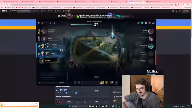 07:39:01Nach dem Ende des Videoinhalts wechselt der Streamer zu League of Legends. Er plant mit einem Freund, die Bot-Lane mit Kog'Maw und Lulu zu spielen, um gezielt Elo zu 'cheaten'. Während des Spiels diskutieren sie über Champion-Stats, Build-Entscheidungen wie AP-Kog'Maw mit Press the Attack und analysieren das Spielgeschehen, Lane-Phasen und Teamkämpfe mit Fokus auf ihre Champions.
