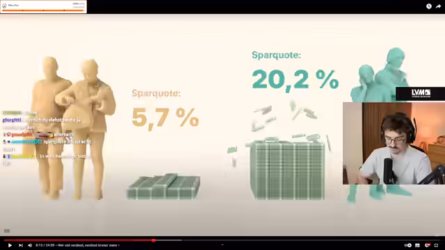 00:18:36Es wird die wachsende Diskrepanz zwischen der Wirtschaftsleistung und den Reallöhnen in Deutschland hervorgehoben. Trotz des Wirtschaftswachstums sind die Reallöhne, insbesondere für Geringverdiener, enttäuschend gering gestiegen. Diese Einkommensschere wirkt sich auch auf die Vermögensbildung aus, da Menschen in höheren Einkommensdezilen einen größeren Teil ihres Einkommens sparen können als Geringverdiener. Der Streamer betont, dass Ausgaben für lebensnotwendige Dinge für Besserverdienende einen geringeren Teil ihres Einkommens ausmachen, was ihnen ermöglicht, mehr zu sparen. Er verdeutlicht, dass selbst bei einem komfortablen Lebensstil mit einer schönen Wohnung, gutem Essen und einem Auto die monatlichen Kosten nicht mehr als 2.000 Euro betragen müssen. Wer deutlich mehr verdient, kann einen großen Teil seines Einkommens sparen, was die Vermögensungleichheit weiter verstärkt.