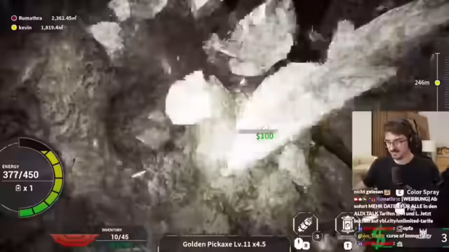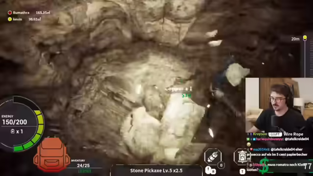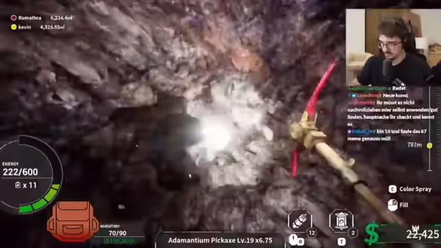 04:10:59Es wird festgestellt, dass eine Treppe gebaut werden muss, um wieder nach oben zu gelangen. Es wird versucht, ein Wire Rope zu kaufen, um das Hochkommen zu erleichtern. Es gibt verschiedene Schaufeln, die durchgescrollt werden können. Die Programmierung des Spiels wird als fehlerhaft kritisiert. Die Nutzung des Wire Rope kostet Batterie, und das Aufladen der Batterie kostet Geld. Es wird gescherzt, wie gut die Streamer auf dem Bau wären. Die Bedeutung von Wire Rope wird geklärt: Drahtseil. Eine Höhle wird entdeckt, in der sich eine Batterie und eine Kiste mit Kleinboost befindet. Es werden 100 Dollar und ein Warp Stone gefunden. Es wird festgestellt, dass es in der Höhle eine Wand gibt, die das Ende markiert. Ein Hopper für 10 Dollar wird entdeckt, aber es ist unklar, wie man aus der Höhle herauskommt. Es wird festgestellt, dass die Energie nicht ausreicht, um zu entkommen. Durch das Einsammeln einer Batterie wird die Batterie automatisch wieder aufgeladen. Es wird überlegt, ob Energie oder Batterien gekauft werden sollen. Es wird eine Diskussion über Karies bei Menschen geführt. Es wird festgestellt, dass ein Charakter mehr abgebaut hat als der andere und nicht mehr aus dem Loch herauskommt. Es wird überlegt, wie der andere Charakter gerettet werden kann. Es wird festgestellt, dass das Wire Rope unbegrenzt ist. Es wird kritisiert, dass die Animationen im Spiel sehr schlecht sind. Es wird vermutet, dass der Sound für das Wire Rope aus einer Unreal Engine Library stammt. Es wird empfohlen, mehr Energie zu kaufen, aber die Battery Charges sind sehr teuer geworden. Es wird gescherzt, dass Trump oder die Grünen daran schuld sind. Es wird Gold gefunden.