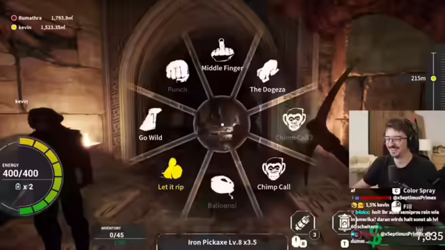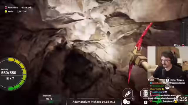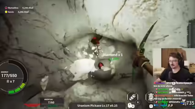 04:17:49Ein Charakter stirbt, und das gesamte Inventar geht verloren. Es wird festgestellt, dass viel Energie benötigt wird, um nach oben zu kommen. Es wird beschlossen, das Rope und die Energie zu upgraden, bevor es weiter nach unten geht. Ein Teleporter wurde gefunden, aber er war nur einmal benutzbar. Es wird vermutet, dass das Wire Rope einen irgendwann automatisch raus teleportiert, wenn es maximal gelevelt ist. Es wird beschlossen, als nächstes das Inventar zu upgraden. Es wird über Crafted gesprochen, und welches Update gespielt wird. Es wird erwähnt, dass es immer Leute gibt, die sich in solchen Spielen auskennen. Es wird vermutet, dass Leute solche Spiele mit Freunden spielen, um sich zu unterhalten. Ein Charakter vergisst, Energie zu restonen und stirbt. Es wird festgestellt, dass das Spiel schon 30 Meter tief ist. Eine neue Höhle wird entdeckt. Es wird beschlossen, ein großes Loch zu machen, um später besser durchjumpen zu können. Ein Teleporter-Stone wird gefunden. Es wird beschlossen, das Backpack zu upgraden und Energie zu kaufen. Es wird etwas gefunden, das abgeholt werden soll. Es wird beschlossen, immer weiter da zu buddeln, wo man herkommt, um ein gerades Loch zu haben. Ein Warpstorm und eine Batterie werden gefunden. Ein Teleportding wird entdeckt, mit dem man von oben nach unten und umgekehrt reisen kann. Es wird beschlossen, dass dies die neue Base ist. Es werden Kisten gefunden, und es wird überlegt, ob man Gold mit hochnehmen kann. Es wird ein Radar gefunden, mit dem man wallhacken kann. Ein Emote, der Chimpcall, wird entdeckt. Es wird aus Versehen der Teleport gedrückt. Es wird ein Schimpansen-Kostüm gefunden. Es wird festgestellt, dass es eine Umkleide gibt. Es wird ein Emote getestet. Es wird festgestellt, dass es einfach zwei Affen sind, die hier runter bauen.