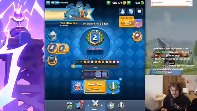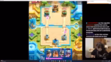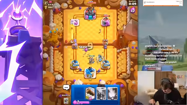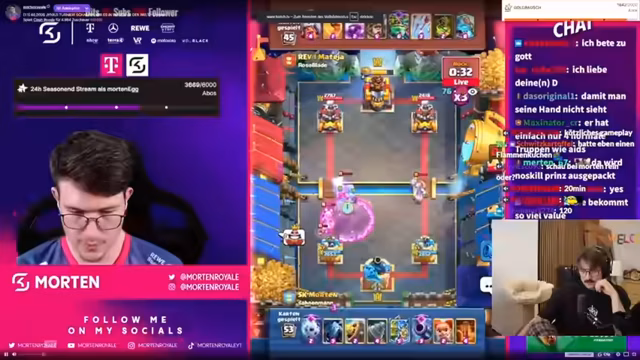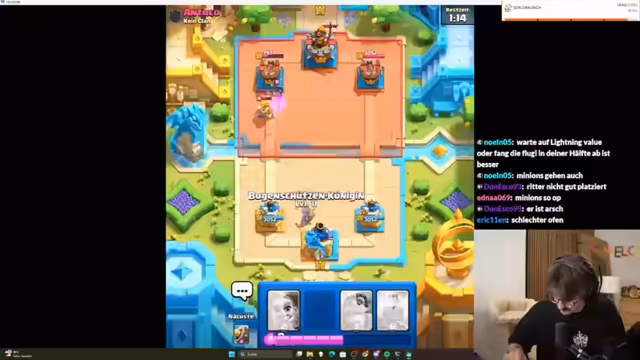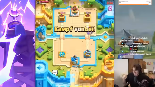 05:53:04Ein Hauptaugenmerk des Streams liegt auf einer Mega-Auswahl-Herausforderung in Clash Royale. Der Streamer lässt den Chat bei den Kartenauswahl-Entscheidungen mitbestimmen, ist mit den Ergebnissen aber unzufrieden. Er verliert mehrere Spiele und kritisiert sowohl seine eigene Spielweise als auch die Auswahl der Karten durch den Chat. Seine Frustration steigt, da er sich als "schlechtesten Spieler der Welt" bezeichnet und das Gefühl hat, seine Zeit bei der Challenge wird verschwendet.