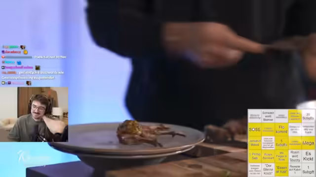 01:45:46Nach einer langen, hitzigen Diskussion über Krieg und Militär schaltet der Stream abrupt zu einem unterhaltsameren Segment. Der Streamer kehrt zum Hauptthema des Abends zurück, dem 'Rosin Restaurant-Bingo'. Er erwähnt, dass er das Bingo-Brett suchen muss, da er es nicht finden kann. Nach einer kurzen Suche findet er es, vergrößert es und macht sich bereit, eine neue Folge der Doku-Serie 'Rosins Restaurants' zu starten. Die Stimmung wechselt komplett von politischem Streit zu spielerischer Vorfreude.