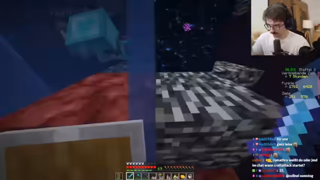 03:34:11Die Spieler navigieren weiterhin durch das End und suchen nach spezifischen Gegenständen wie verzierten Krügen und Schlüsseln. Während der Suche stoßen sie auf Tommy, einen Chicken Chocci, den sie erfolgreich besiegen. Es gibt Verwirrung darüber, wie Gegenstände in die verzierten Krüge gelegt werden, wobei ein Spieler feststellt, dass dies nicht möglich ist. Die Suche nach den Krügen gestaltet sich schwierig, da die Spieler sie im Inventar nicht mehr als verziert erkennen. Sie beschließen, mit den gefundenen Schlüsseln etwas zu plündern, bevor sie weiterziehen. Ein Spieler äußert Frustration über den Mangel an Blöcken, was die Navigation erschwert. Nach einigen Versuchen gelingt es, einen Krug zu öffnen, und sie finden Gold, obwohl sie sich mehr erhofft hatten. Die Spieler planen, den Bereich zu verlassen und sich auf den Weg zum Portalraum zu machen, um weitere Blöcke zu sammeln und den Enderman zu bekämpfen.