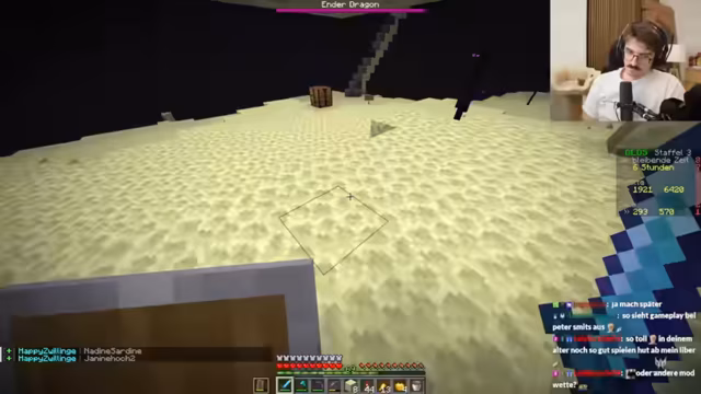 03:38:20Die Spieler bereiten sich auf den Kampf gegen einen Enderman vor. Ein Spieler schlägt vor, sich zwei Blöcke hochzubauen und den Enderman von dort aus anzugreifen, um sicherzustellen, dass er nicht sauer wird. Alternativ wird die Nutzung eines Bootes in Betracht gezogen, um den Enderman zu bekämpfen. Während des Kampfes werden sie von einem Schützen angegriffen, was sie zwingt, sich neu zu positionieren. Sie entdecken einen Enderman in einem Käfig und planen, diesen zu besiegen, indem sie sich in einer Ecke hochbauen und ihn mit einer Schaufel angreifen. Nach erfolgreichem Kampf wird ein Achievement freigeschaltet. Die Spieler konzentrieren sich anschließend auf den Enderdrachen, stellen fest, dass noch Kristalle aktiv sind, die ihn heilen, und müssen diese zuerst zerstören. Nach der Zerstörung der Kristalle beginnt der finale Angriff auf den Drachen. Ein Spieler äußert Bedenken, dass der Drache verschwunden ist, bevor sie den letzten Treffer landen können, doch sie schaffen es, ihn zu besiegen und die Belohnungen einzusammeln.