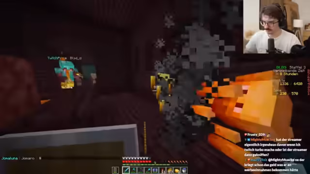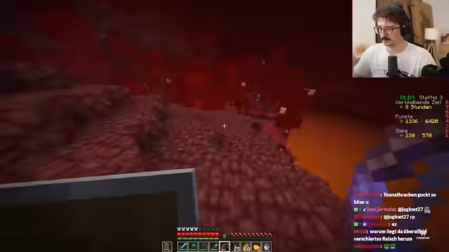 02:12:16Die Spieler bereiten sich auf den Nether vor, indem sie Pfeile farmen und die Haltbarkeit der Elytra reparieren. Sie planen, im Nether viel Quarz abzubauen und weitere Achievements zu sammeln. Ein Spieler muss noch Schaden durch einen Süßbärenstrauch erhalten. Im Nether angekommen, treffen sie auf einen Piglin, und es wird überlegt, wie man ihn töten kann, während er Gold in der Hand hält, um ein Achievement zu erhalten. Sie müssen Gold abbauen, um Goldschuhe herzustellen, die sie tragen müssen, um nicht von Piglins angegriffen zu werden. Ein Lama wird provoziert, um es anspucken zu lassen, was ebenfalls ein Achievement ist. Ein Portal wird kaputt gemacht, und ein Bett wird explodieren gelassen, um weitere Achievements zu erhalten. Sie suchen nach Magma-Slimes und überlegen, wie sie alle 10 Baumarten im Nether wachsen lassen können.