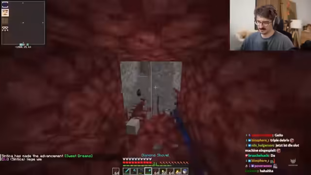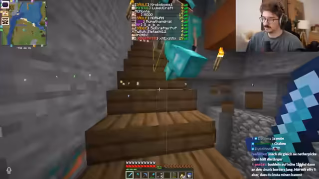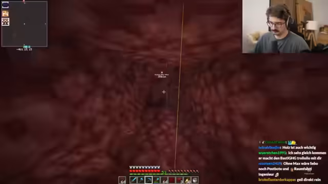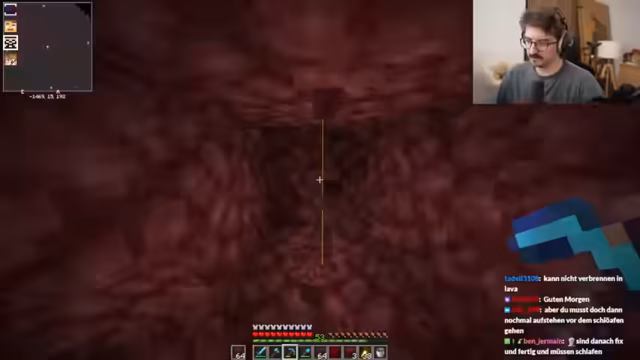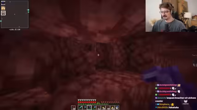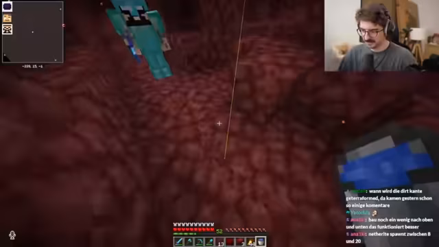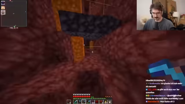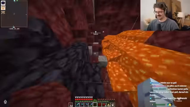01:34:39Im Nether erklärt der Streamer seinem Partner Metashi die Gefahren, insbesondere die schnell fließende Lava. Er demonstriert, dass Wasser nicht wie in der Oberwelt löscht und warnt davor, in der unvorhersehbaren Umgebung zu sterben. Um effizient nach Netherit zu suchen, nutzen sie eine Technik, bei der sie an den Chunk-Grenzen, wo sich bestimmte Linien auf der Minimap kreuzen, 2x2 große Gänge nach vorne bauen, um die Wahrscheinlichkeit zu erhöhen, das seltene Erz zu finden.