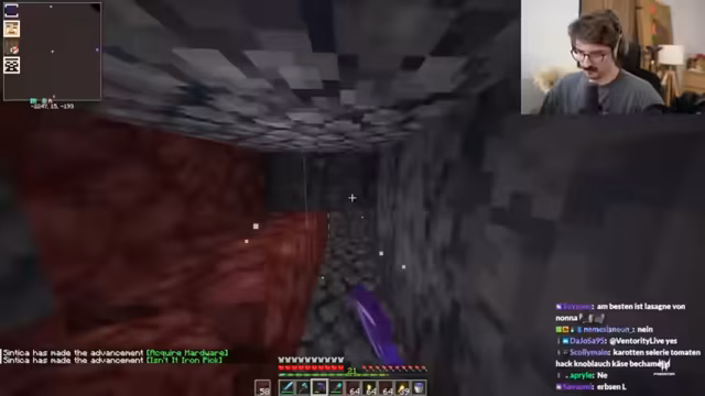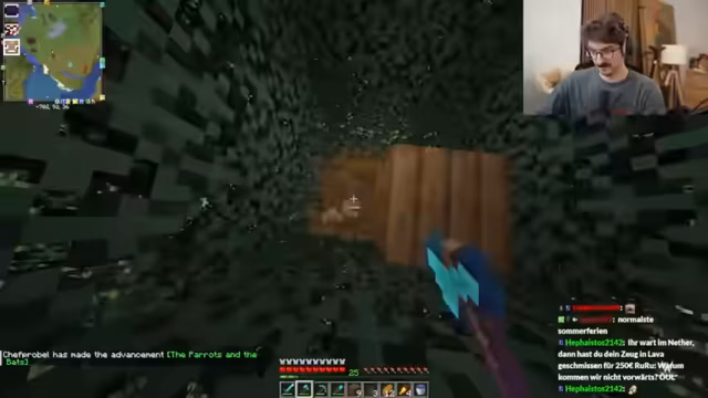 02:15:02Nach dem Zusammenfinden des Teams geht die Suche weiter. Sie finden erfolgreich weitere Blöcke Ancient Debris, was kurzzeitig für Freude sorgt. Gleichzeitig bleibt der Frust über das Risiko der Lava-Abgründe bestehen und der Streamer verliert sich mehrmals im unwegsamen Gelände. Obwohl der Fortschritt sichtbar ist, ist die Motivation durch die vorherigen Spannungen und die anhaltende Gefahr getrübt, und das Ende der Netherit-Expedition ist noch nicht in Sicht.