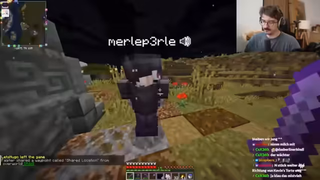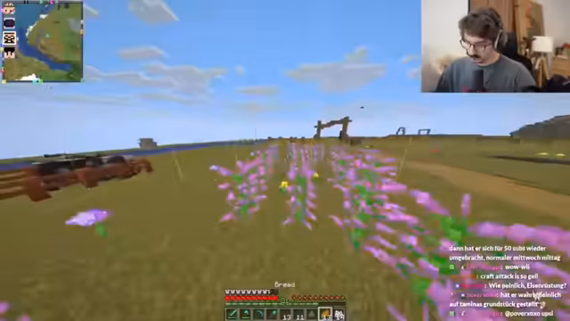 07:25:07Der Streamer benötigt Wolle, um Teppiche für seinen Bau zu craften, und ist auf der Suche nach weißer Wolle. Sein Mitspieler Metashi hat nur blaue Schafe. Es wird über das Färben von Wolle diskutiert. Der Streamer navigiert im Spiel zu einem bestimmten Ort, um eine von Hanno versuchte Kiste mit Bonemeal zu finden, stößt aber nur auf leere Kisten oder falsche Objekte. Er ist verärgert und fühlt sich von Hanno hinters Licht geführt. Es werden verschiedene alltägliche Probleme im Spiel gelöst, wie das Braten von Fleisch oder das Herstellen von Werkzeugen.