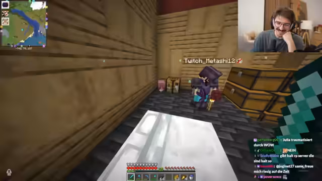 06:45:25Der Streamer berichtet von Husten nach einer Reise nach London und versucht, im Spiel Holz zu farmen, da er keines mehr hat. Er tauscht mit einem Mitspieler namens Felix Bone Meal gegen Holz. Es gibt Diskussionen über Redstone, das für 25 Subs gehandelt wird, was als "desperate" beschrieben wird. Der Streamer plant, seine Netherite-Vorräte zu verwenden, um einen verzauberten Schild herzustellen, und beschwert sich, dass sein Mitspieler 50 Subs für einen Trade ohne vorherige Abstimmung verwendet habe, was den Fortschritt behindert habe.
