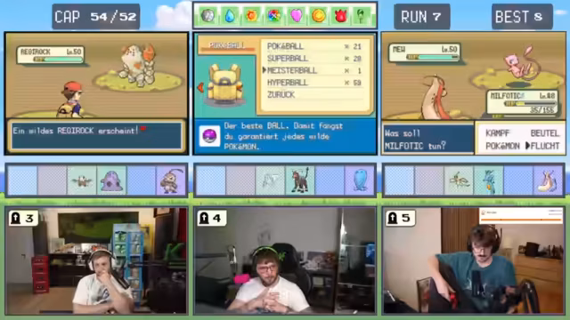04:28:11Nachdem das Team sicher ist, zeigt ein zufälliges Encounter ein Legendary Pokémon: Latios. Der Streamer ist zutiefst überrascht und schrecklich aufgeregt, da er mit Regirock gerechnet hatte. Mit viel Aufregung und einem Augenzwinkern gibt er dem gefangenen Latios den Spottnamen 'Latiosch' und 'Miu'. Der Fang ist mit einem Meisterball geglückt, was für den Streamer ein riesiger Triumph und ein Wendepunkt im Run darstellt. Der Erfolg wird als glückliches Schicksal gewertet.