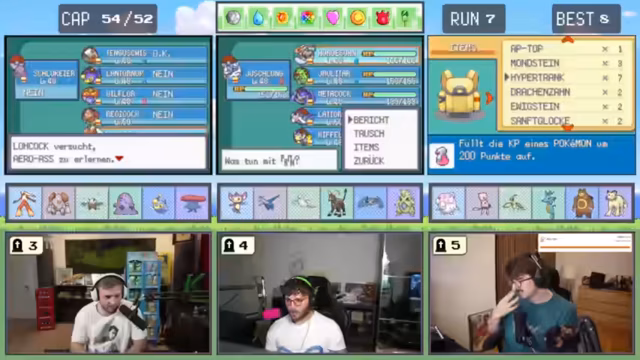 04:50:51Während des intensiven Vorbereitungsprozesses für die Siegestraße wird der Streamer von der Menge an Arbeit und Stress überfordert. Er muss verschiedene Attacken anpassen, Pokémon Items wie Überreste oder Wahlbänder zuweisen und fehlende Attacken wie eine Feuerattacke für Latios erlernen. Der Mangel an Ressourcen wie Pilzen für App-Upgrades und an Geld für den Kauf von Übertränken bereitet ihm große Sorgen und zwingt ihn zu strategischen Kompromissen, um das Team so gut wie möglich für den finalen Kampf zu rüsten.
