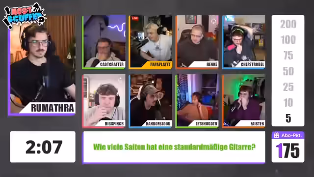 03:15:16Die erste offizielle Runde des Spiels beginnt, Hugo beantwortet die erste Frage richtig. Es folgen weitere Fragen, die von den Teilnehmern korrekt beantwortet werden. CarsCrafter(Heiko) entscheidet sich, die erreichten Punkte zu sichern. Es wird diskutiert, ob eine Antwort von Chef Strobel korrekt war, da Stickstoff der Hauptbestandteil der Luft ist. Hanno(Hand of Blood) beantwortet eine Frage, obwohl er zuvor gesaved hat, wodurch er wieder von vorne beginnt. Henke wird am Ende der Runde rausgewählt und erhält die Chance, sich durch das Beantworten von Fragen zu retten. Henke hat Schwierigkeiten mit den Fragen, kann sich aber mit der letzten Frage retten. Es wird über die korrekte Antwort auf eine vorherige Frage diskutiert, und Henke erhält nachträglich Recht.