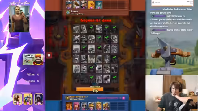 05:10:10Ein wiederholtes Problem im Spiel wird aufgezeigt: der Spieler ignoriert taktische Ratschläge und handelt impulsiv. Trotz einer vorteilhaften Position mit einem Royal Giant, Dark Prince und Berserkerin, verliert der Spieler das Match, da er zu viele Einheiten gleichzeitig einsetzt und kein Elixir für den Verteidigung hat. Der Streamer erklärt, dass der Sieg durch einen gezielten Verteidigungszug und einen kontrollierten Push mit dem Riesen an der Brücke möglich gewesen wäre, stattdessen aber zu viele Missplays die Chances zunichtemachten.