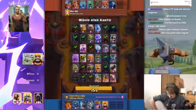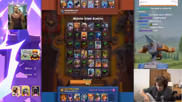 04:10:38Nachdem der Pokémon-Run vorerst abgebrochen wird, wechseln Streamer und Co-Spieler zu dem Spiel Clash Royale. Sie starten eine sogenannte 'Mega-Auswahl-Herausforderung', bei der sie gegenseitig Karten aus ihren Decks entfernen müssen. Es kommt zu hitzigen, teils verlorenen Duellen und Überraschungen, wie dem Ziehen von seltenen Karten. Der Fokus liegt auf der Zusammenarbeit und dem Coaching durch den Co-Spieler.