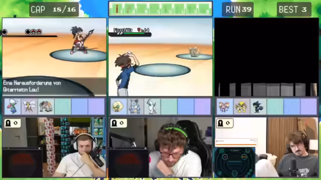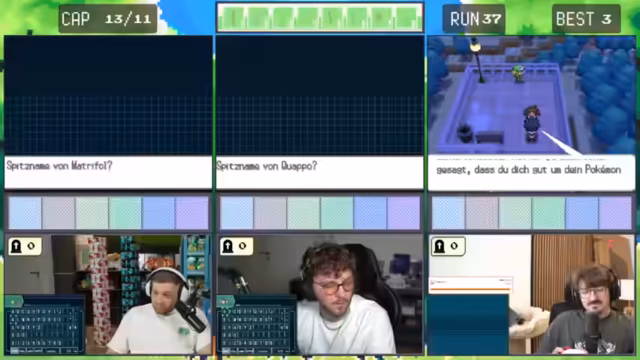02:38:36Nach einem Blackout wird die Situation ernst. Der Streamer und sein Partner Chef haben ein kleines Problem: der 'Run' ist gescheitert, weil sie einen Trainer nicht richtig interpretiert haben. Sie überlegen, ob sie einen Trainer anlaufen sollten, bei dem sie garantiert ein Item wie eine Beere oder sogar einen Meisterball erhalten könnten. Die gemeinsame Einschätzung ist jedoch, dass dies zu riskant ist. Der Gegenstand könnte eine 'Janago-Beere' sein, was einen Shutdown verursacht, da der nächste Trainer 'Drachenwut' einsetzen würde und sie den gesamten Run neu starten müssten. Ein solcher Fehlschlag wird als 'rational unglaublich dumm' und 'mieser Wichser' bewertet.