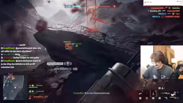 12:55:55Die Frustration über Battlefield steigt weiter an. Der Streamer beschreibt, dass er von Spots getötet wird, die er nicht erkennt, und dass er keine Munition mehr hat. Er ist unzufrieden mit der gegnerischen Strategie, die aus seiner Sicht passiv ist und den Spielspaß nimmt. Gleichzeitig findet er Mechaniken wie das Abrollen nach einem Fallschirmsprung interessant, fühlt sich aber insgesamt im Spiel nicht wohl.