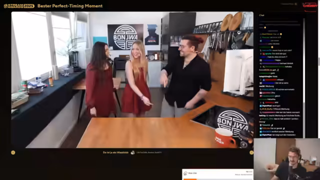 01:51:38Bei der Abstimmung für das "beste Streamer-Duo" ist der Streamer verwundert, dass er und sein häufigster Kooperationspartner Max nicht nominiert sind. Stattdessen favorisiert er Niekbeats und Kroko-Boss. Bei "bestem Stream Crossover" gewinnen Hugo und MrBeast, deren Treffen als "surreal" beschrieben wird. Ein weiteres Crossover mit Henno und Michael Bulli wird als lustig und ungewöhnlich angesehen.