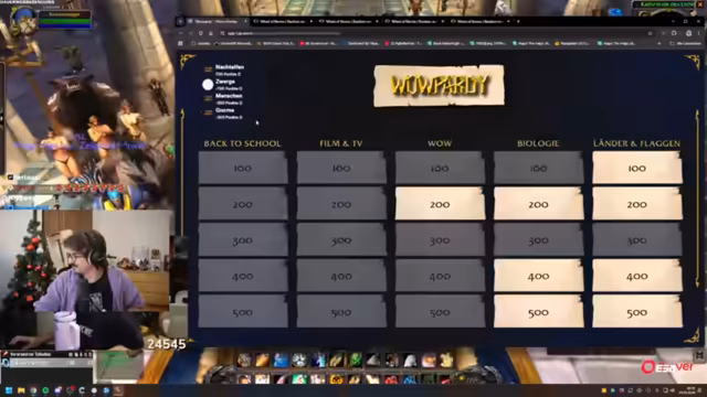 06:41:35Zwischen 24095 und 24240 wechseln sich historische, kulturelle und WoW-Fragen ab. Spielermeldungen zum Vertragsabschluss des Ersten Weltkriegs (Versailler Vertrag) und zur Hauptstadt der Blutelfen (Silbermond) werden abgefragt. Das Team der Nachtelfen zeigt Wissenslücken bei Geschichte, während bei den Zwergen die Kategorie 'WoW' punktet. Ein Spieler muss aufgrund von Missverständnissen Punkte abgeben.