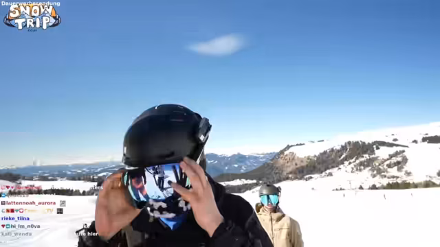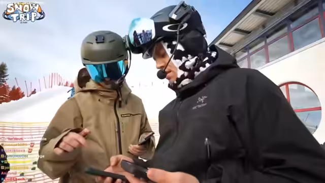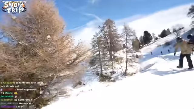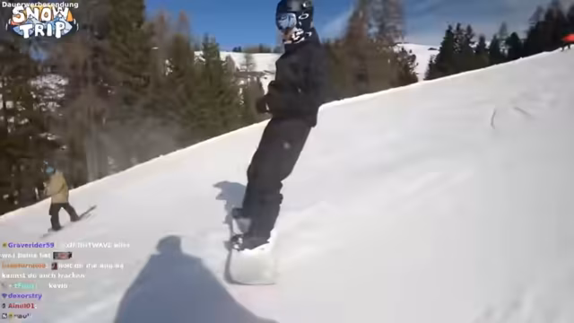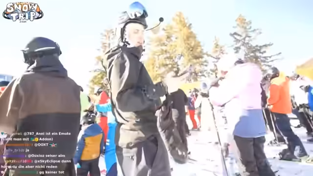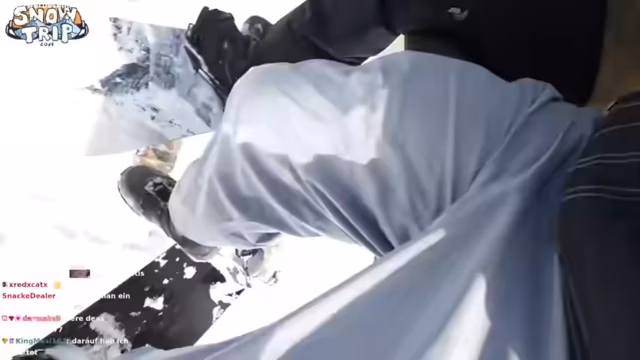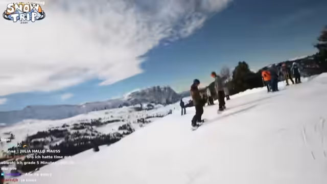 03:38:50Die Streamer treffen im Skigebiet ein und beginnen mit den ersten Fahrten. Es gibt anfängliche technische Probleme mit dem Mikrofon und die Kommunikation der Gruppe ist schwierig. Bei den ersten Versuchen, abseits der Pisten zu fahren, gerät einer der Teilnehmer in tiefen Schnee, was zu einem komischen Moment führt. Auch ein ungewöhnlicher Vorfall ereignet sich, als einer der Snowboard-Bindungen ausfällt und im Schnee verloren geht, jedoch schnell wieder gefunden wird. Die Gruppe probiert verschiedene Strecken und Geländetypen aus, um sich auf das Terrain einzurunden.