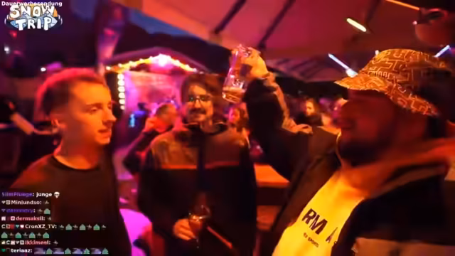 08:08:29Nach der intensiven Abfahrt und dem langen Tag auf der Piste geht es zurück zum Ausgangspunkt. Streamer erwähnen, dass sie ein gemeinsames Bild machen und sich für den Auftritt im Live-Stream auf meinem Kanal bedanken. Die Stimmung ist ausgelassen, es gibt Gags wie 'Cancel Hugo'. Zum Abschluss wünschen sich alle einen schönen Abend und sind bereit für den Après-Ski. Der Stream endet mit einem gelungenen ersten Tag im Snowtrip.