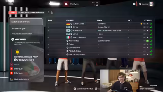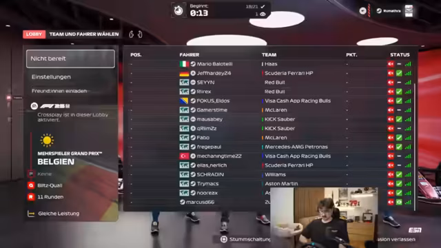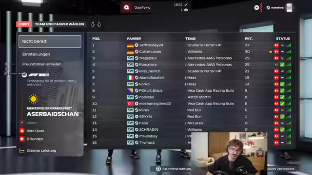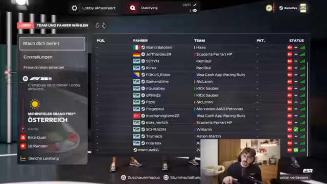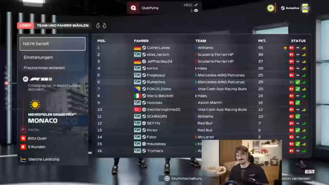 07:24:05Nachdem alle Teilnehmer in der Lobby sind, beginnt das Qualifying. Die Fahrer starten auf ihre festgelegten Plätze, wobei einige mit Handicaps hinten starten. Die ersten Rennen finden auf den Strecken Österreich, Monza, Baku und Monaco statt, jeweils als 25%-Rennen mit 13 Runden und verdoppelten Punkten. Der Rennstart ist holprig, mit mehreren Dreher und Kollisionen in der ersten Kurve. Der Streamer, der im Qualifying einen schlechten Start hinlegt, verspricht, sich im Rennen zu steigern und bittet seinen Teamkollegen Paul Frege, sich im Rennen zu konzentrieren.