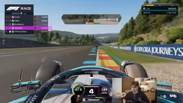 09:19:36Nachdem er den Boxenstoppsort nicht kennt, muss er im Chat nachfragen, wann und wo er die Box anfahren soll. Er beschließt, in Runde 5 von den weichen auf mittlere Reifen zu wechseln. Währenddessen kämpft er darum, den starken Fahrer Sascha hinter sich zu halten. Der Streamer ist sich unsicher, ob er auf den Geraden oder in den Kurven schneller ist. Er muss aggressive Fahrer auf der Strecke konfrontieren, die ihn in die Bande drängen und so seine Position gefährden. Es kommt zu frustrierenden Momenten, bei denen er sich durch unfaires Fahrverhalten behindert fühlt und seine Konzentration leidet.