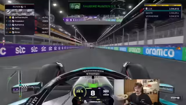 09:16:40Zuerst entscheidet der Streamer, auf weichere Reifen zu wechseln, da er mit härteren Reifen das Rende nicht zu Ende fahren kann. Er fährt zunächst auf weichem Gummi und plant, die Reifen bei der Boxenstoppsituation für den Rest des Rennens zu nutzen. Während dieser Phase gerät er in ein Chaos, als er in einer Kurve abdriftet und dabei wichtige Zeit verliert. Es kommt zu Missverständnissen mit dem Fahrer Sascha, der auf der Strecke hinter ihm fährt. Der Streamer muss feststellen, dass er auf den falschen Reifen gestartet ist und nun eine strategische Boxenstoppsituation hat, die er jedoch noch nicht genau kennt.