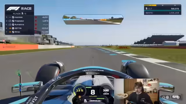 07:58:51Während des Renns kämpft der Streamer darum, von hinten nach vorne zu kommen. Er überholt einige Fahrer, verliert aber durch einen Dreher und eine Zeitstrafe wichtige Positionen. Die Konzentration ist ein zentrales Thema, da der Streamer feststellt, dass der Sprech- und Chatverkehr die Konzentration der Fahrer beeinträchtigt. Trotz der widrigen Umstände und der technischen Schwierigkeiten bleibt die Stimmung im Team hoch, und der Streamer betont die Wichtigkeit eines sauberen, aber entschlossenen Fahrens, um im Rennen Punkte zu sammeln.