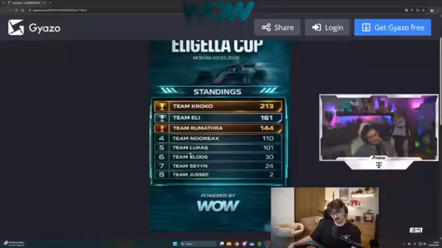 10:34:29Der Stream beginnt mit der Vorstellung der F1 Cup-Ergebnisse. Team Youssef belegte den neunten, Team Fabo den achten und Team Sane den siebten Platz. Eldos und Musti teilen sich den sechsten, Kata Lukas und Schradin den fünften Platz. Schradin wird für seinen taktischen Move im Baku-Rennen gelobt, als er als Erster in die Boxengasse fuhr und das Rennen führte. Gewonnen hat der Cup von Kroko und Sascha mit 213 Punkten, gefolgt von Team 2 mit 161 und Team 3 mit 144 Punkten.