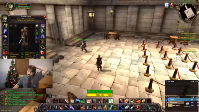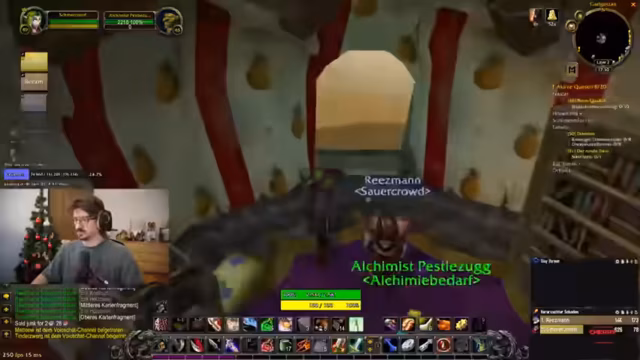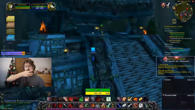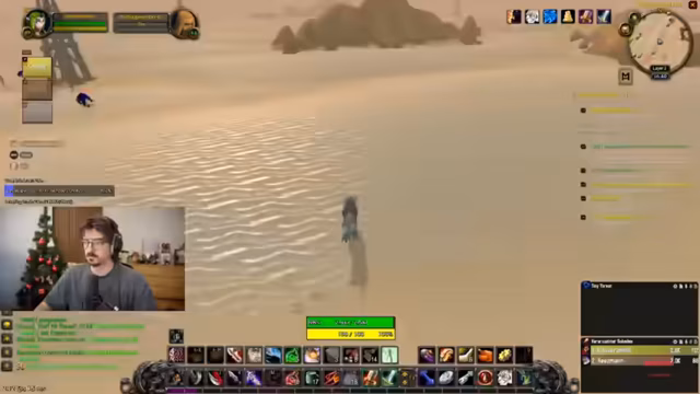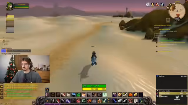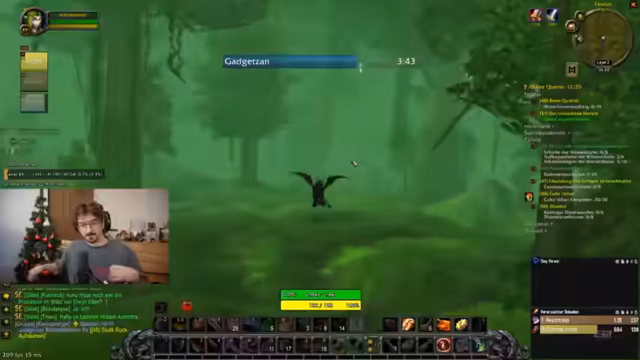 08:14:33Die Gruppe bereitet sich auf den Dungeon vor. Sie müssen eine Quest in der schimmernden Ebene annehmen und fliegen dann nach Tanaris. Dabei wird die mangelnde Quest-Erfahrung von einem Teilnehmer angesprochen, während ein anderer betont, aufgrund seiner Erfahrung in Shooter-Spielen gute Fähigkeiten mitzubringen. Die Diskussion dreht sich um World of Warcraft vs. andere Genres. Es werden Buffs (z.B. Darkmoon Faire) geholt und Portale für schnelles Reisen genutzt.